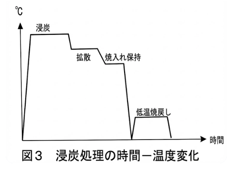 浸炭処理の時間—温度変化を(図3)に示します。一般的な浸炭温度は920~930℃で、C(炭素)濃度を上げる場合は温度を高く、有効硬化層深さ註1)(炭素の侵入深さ)を大きくするには時間を長くします。