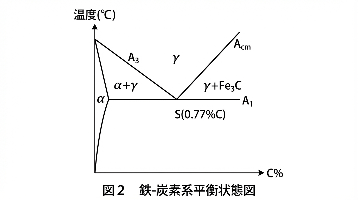 S15C(S15CK)、S20C(S20CK)など機械構造用炭素鋼では網状Fe3C(セメンタイト)もしくはγR(残留オーステナイト)の析出を防ぐために炭素濃度を共析点(S)の0.77%以下に抑える必要があるため920℃程度の浸炭処理温度を採用します。また、炭素鋼では焼入れ性を向上させるためにC(炭素)以外にNH3(アンモニア)の滴注によりN(窒素)の力を借りることになります。結果的に、N(窒素)雰囲気を作り出して“鉄-炭素系平衡状態図(図1)”のA1変態点を下げることにもつながります。